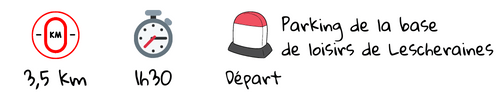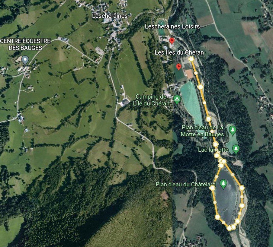 1/ Démarrez en laissant la base nautique dans votre dos et en vous dirigeant vers les terrains de foot, le départ se fait au fond côté Chéran.